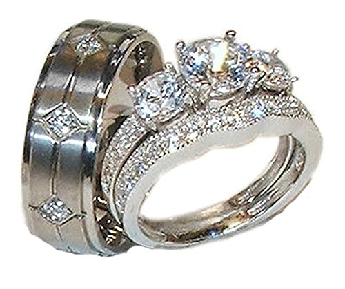His Hers 3 Piece 925 Sterling Silver & Titanium Wedding Ring Set