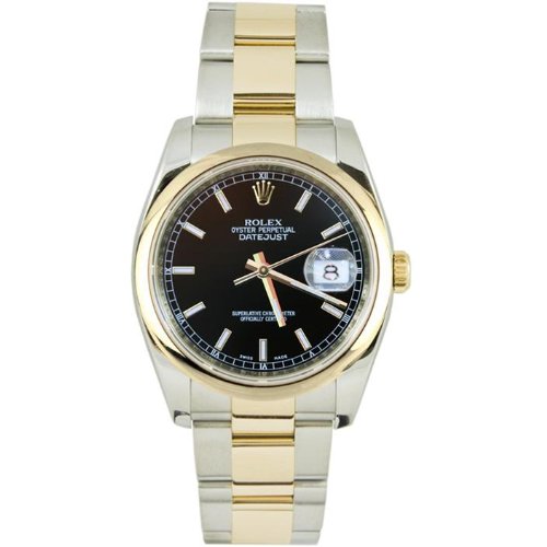 Rolex Mens New Style Heavy Band Stainless Steel & 18K Gold Datejust Model 116203 Oyster Band Smooth Bezel Black Stick Dial