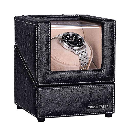 Single Watch Winder Newly Upgraded, with Flexible Plush Pillow, in Wood Shell and Black Leather, Japanese Motor, 4 Rotation Mode Setting, Fit Lady and Man Automatic Watch