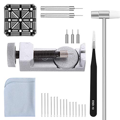 Watch Band Strap Link Pins Remover Repair Tool,24 in 1 Kit with 3 Extra Tips Replacement,20PCS Cotter Pin,1PCS Holder,1PCS Head Hammer,1PCS Tweezers,1PCS Glasses Cloth