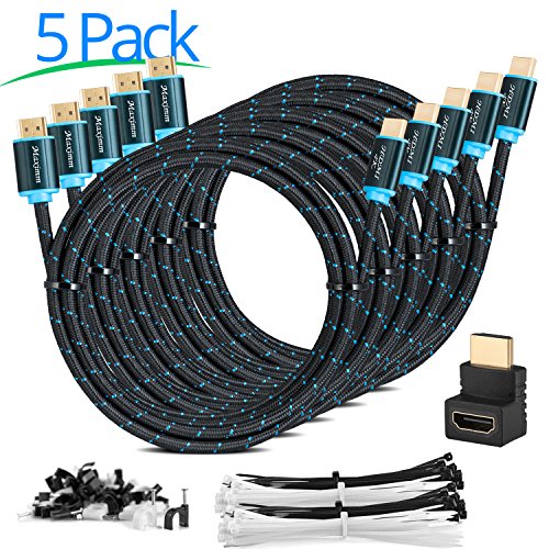 Maximm High-Speed HDMI 2.0 4K Nylon Braided Cable, 8 Feet, 5-Pack (Includes Cable Clips, Ties and Right Angle Adapter)