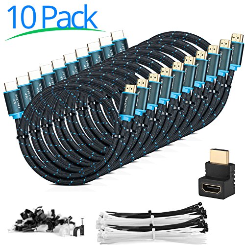 Maximm High-Speed HDMI 2.0 4K Nylon Braided Cable, 4 Feet, 10-Pack (Includes Cable Clips, Ties and Right Angle Adapter)