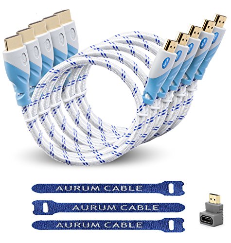 Aurum Classic Series – Pack of 5 HDMI Cable with Ethernet (3 FT) – Supports 3D & Audio Return Channel [Latest Version] + Right Angle Adapter and Velcro Cable Tie – 3 Feet – 5 Pack