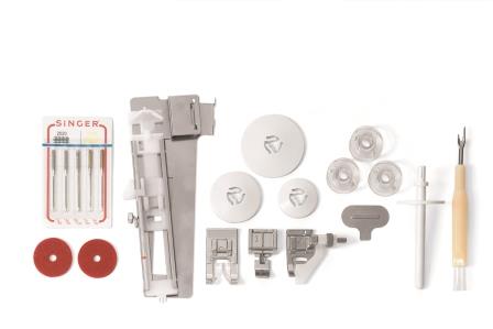 All-Purpose Foot Zipper Foot Buttonhole Foot with Underplate Blind Hem Foot Satin Stitch Foot Pack of Needles Bobbins (Class 15J) Thread Spool Caps Auxiliary Spool Pin Spool Pin Felt Needle Plate Screwdriver Seam Ripper/Lint Brush Soft-Sided Dust Cover Machine Intro DVD Instruction Manual with Stitch Guide Inside Quick Start Guide Foot Control Power Cord