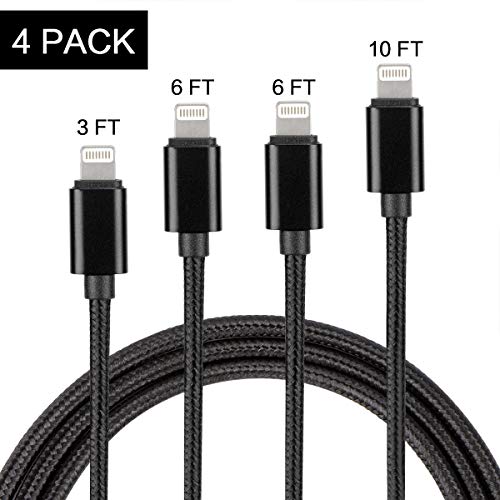 [4 Pack: 3ft/6ft/6ft/10ft] Newest Charging Cable, USB Charging Cable, Fast Charging Power Cord, Cable Compatible for iPhone X/8 Plus/7 Plus/6 Plus, iPad Pro/Mini, iPod Touch, Zinc Alloy, Black
