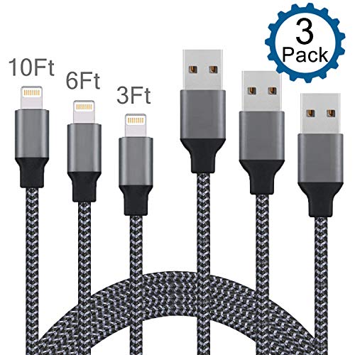 Live2Pedal Compatible iPhone Charger,3Pack 3FT/6FT/10FT Lightning Cable,Nylon Braided Charging Cables USB Charger Cord iPhone XS/XR/Xmax/X/8/8Plus/7/7Plus/6SPlus/6S/6Plus/5/5S/5C/iPad More(Black+Gray)