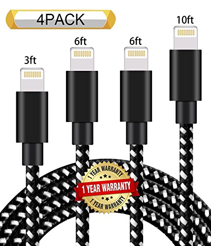 Ulimag Lightning Cable 4Pack 3FT 6FT 6FT 10FT Nylon Braided Certified iPhone Cable USB Cord Charging Charger for Apple iPhone 7, 7 Plus, 6, 6s, 6+, 5, 5c, 5s, SE, iPad, iPod Nano, iPod Touch (Black)