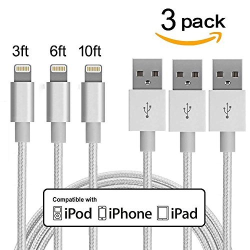 WEIPAI iPhone Charger 3Pack 3FT/6FT/10FT(1M/2M/3M) Nylon Braided 8 pin Charging Cables USB Charger Cord, Compatible with iPhone 7/7 Plus/6s/6s Plus/6/6 Plus/5/5S/5C/SE/iPad and iPod (Silver)