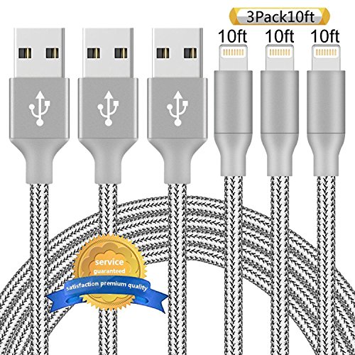 Aonsen Lightning Cable 3Pack 10FT Nylon Braided Certified iPhone Cable USB Cord Charging Charger for Apple iPhone 7, 7 Plus, 6, 6s, 6+, 5, 5c, 5s, SE, iPad, iPod Nano, iPod Touch (Grey)